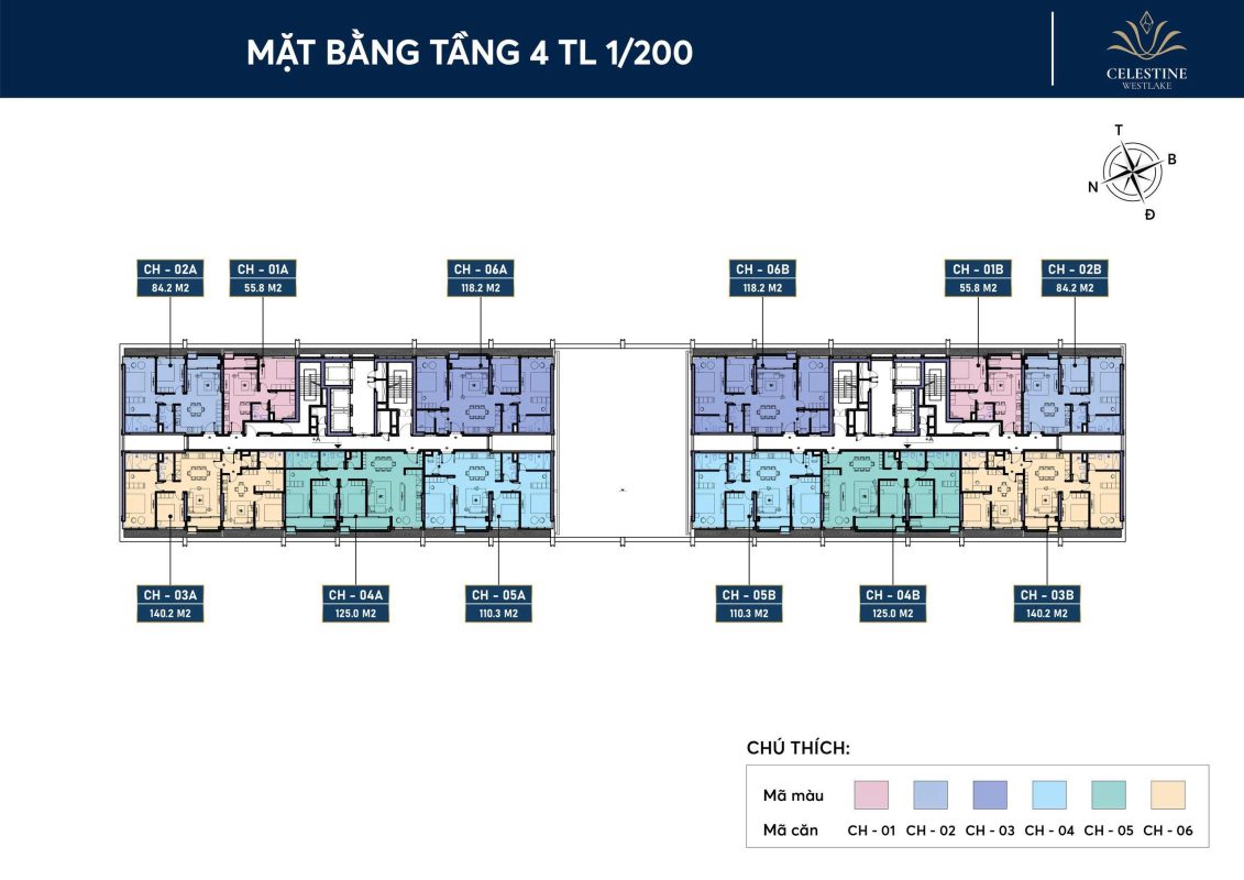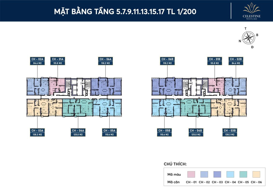Mặt bằng thiết kế dự án Celestine Westlake Tây Hồ được quy hoạch thông minh và khoa học, nhằm tối ưu hóa không gian sống và mang lại sự tiện nghi tối đa cho cư dân. Đây là dự án hiếm hoi với mật độ căn cực thấp chỉ 6 căn/sàn – 3 thang máy – 36 căn/thang – 2 thang thoát hiểm đảm bảo an toàn tuyệt đối cho cư dân. Toàn bộ các căn hộ đều vuông vắn, mặt tiền rộng, chiều cao trần 3.6m lấy ánh sáng tối đa vào nhà.